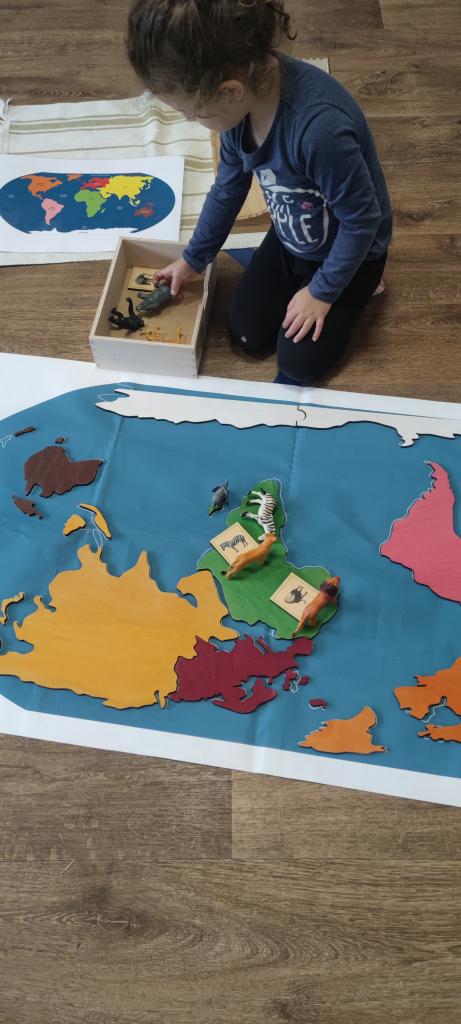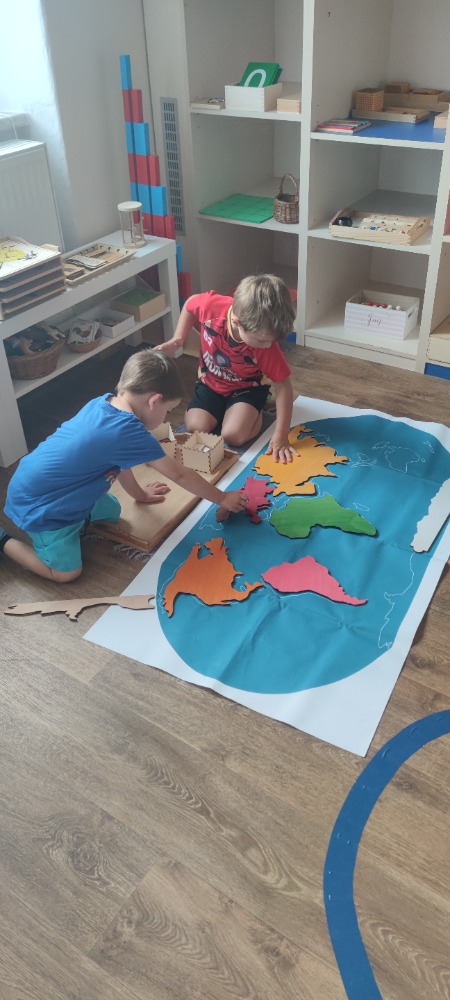 1. Děti při prvním seznámení s mapou na tenké obrysy na podložce skládají dřevěné světadíly a největší ostrovy světa.